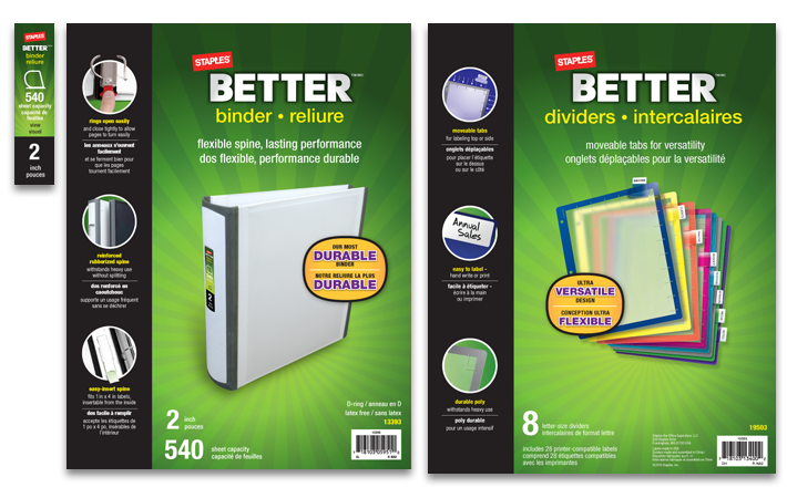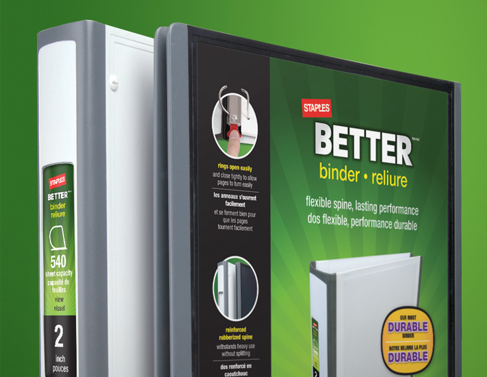 StaplesĀ® Better Binders and File Folders are designed to survive the worst life can throw at them while remaining stylish. With features like rubber edging and seams and reinforced rings, the goal was to communicate something that was both durable and fashionable.