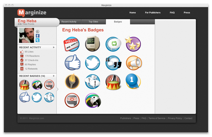 As users associate themselves with certain themes and sites online, they are sporadically awarded badges which help shape their online profile.