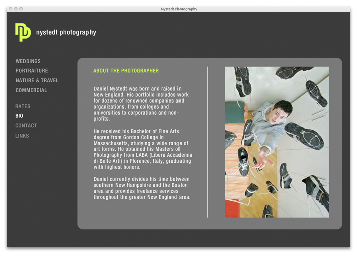 Dan Nystedt is a premiere event and commercial photographer based in New England. Voted New Hampshire’s Best Wedding Photographer in 2009 by Bridal Guide magazine, Dan decided that a cohesive brand identity was in order, so he comissioned me to design a new logo, website and print materials.