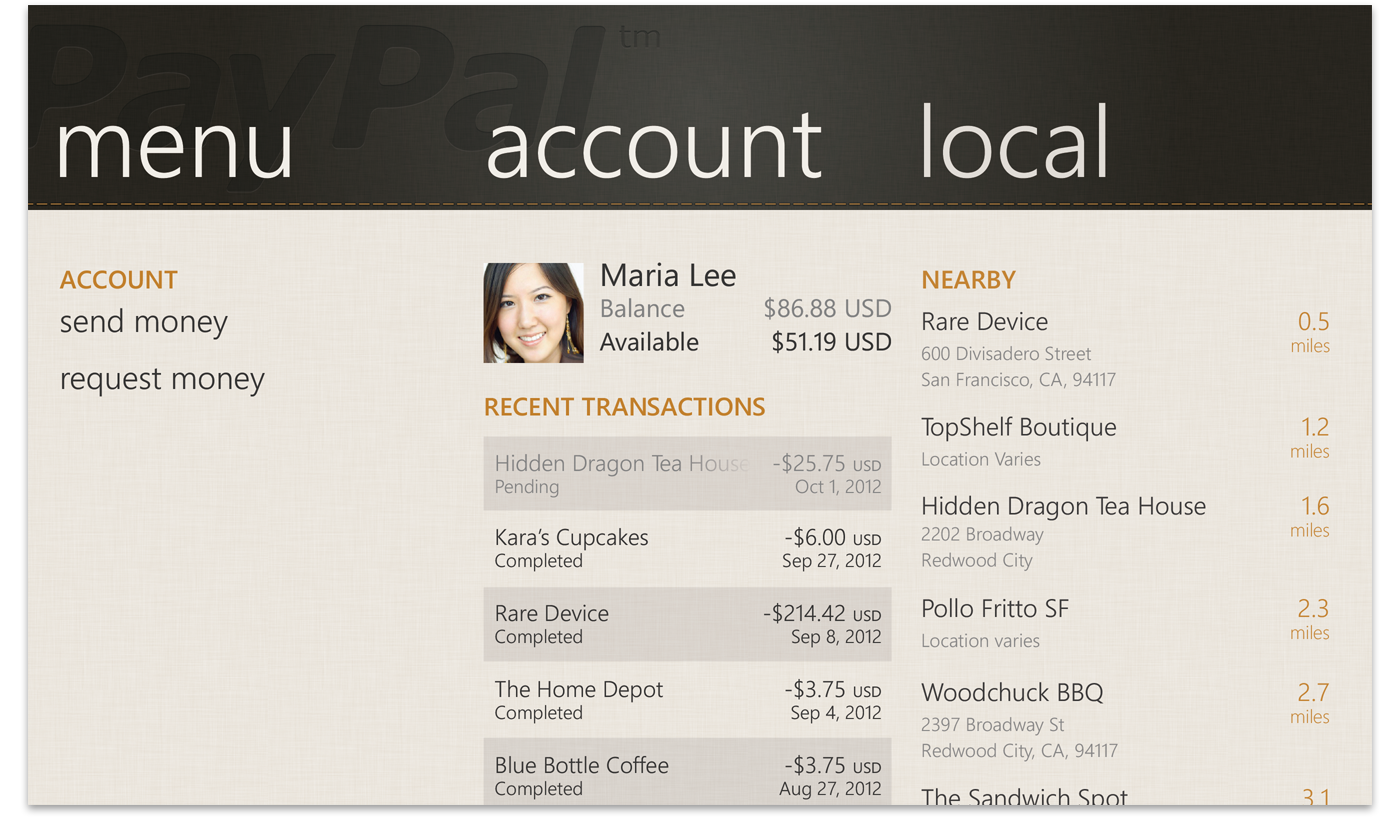 Adapting PayPal’s the newly forged skeuomorphic app style to a more minimalistic, “metro” style was a challenging but rewarding change, resulting in a much cleaner aesthetic than its iOS and Android counterparts.